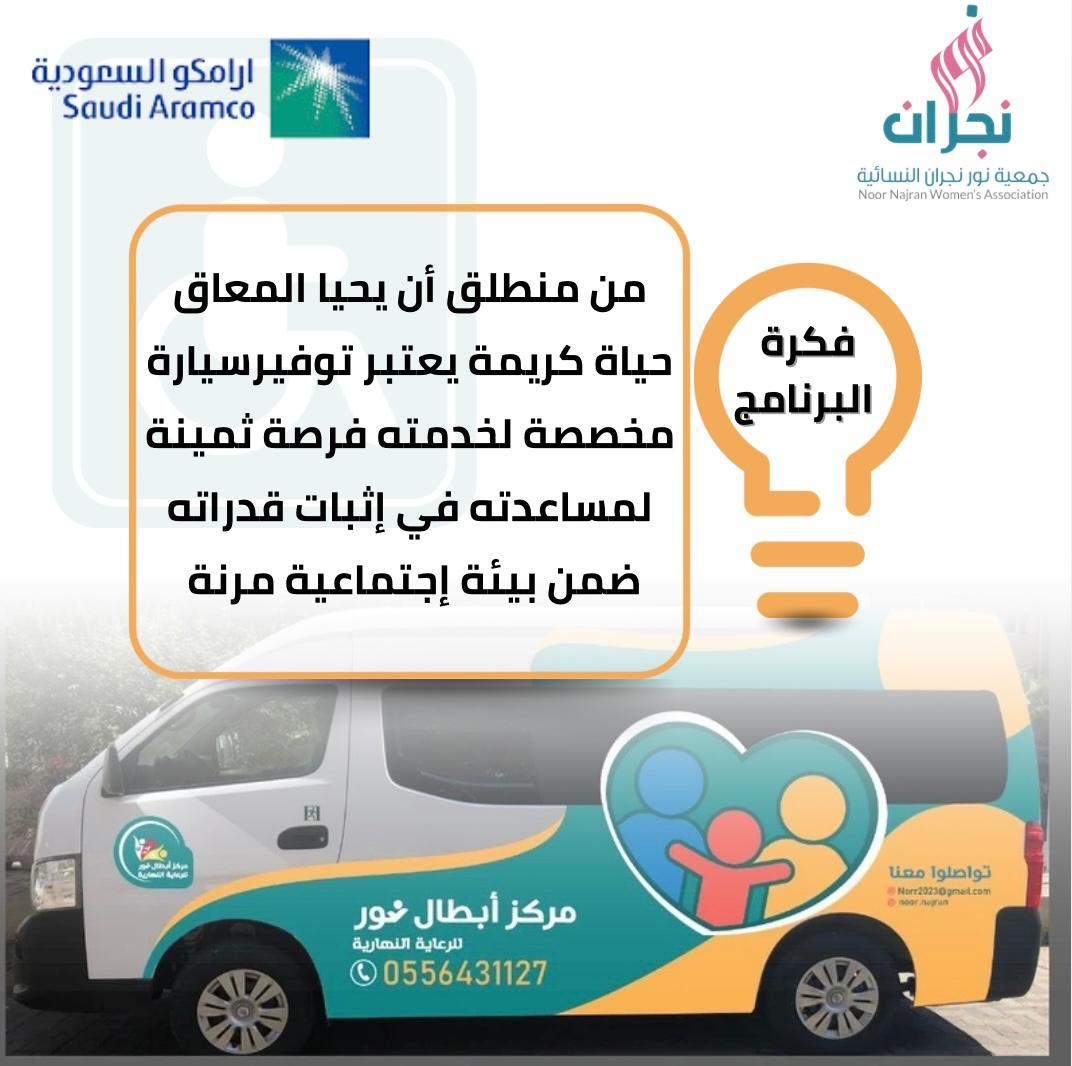 وفرت شركة آرامكو السعودية لجمعية نور نجران النسائية (سيارة) لخدمة ذوي الإعاقة وهي مخصصة ومجهزة بروافع هيدروليكية، وبمستوى أمان عالي؛ تساعدهم على إنجاز مهامهم وتسهيل تحركات ذوي الإعاقة الحركية، وإثبات قدراتهم وتجاوز كل العقبات والتحديات التي تواجههم دون مساعدة الأخرين لهم وإستئناف حياتهم كأعضاء فعّالين فالمجتمع وقد بلغ عدد المستفيدين من هذه الخدمة ٩٥١مستفيد.